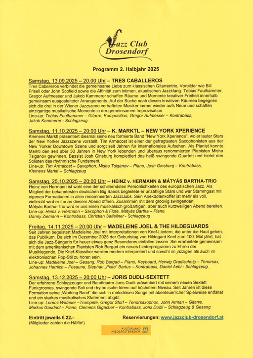IBAN AT12 4300 0000 0470 1553 lt. auf JazzClub Drosendorf oder melden Sie sich sich beim Kassier an der Abendkassa.