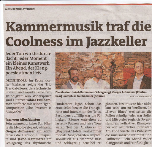 Tres Caballeros, also je nach Übersetzung drei Ritter, drei Herren, oder, was es vielleicht im gegebenen musikalischen Zusammenhang am ehesten trifft: drei Gentlemen. Die Art und Weise, in der sich Tobias Faulhammer, Gregor Aufmesser und Jakob Kammerer aufführen, hat nämlich etwas äußerst Spielerisch-Elegant-Aufmerksames. Die drei sind bekannte Größen in der reichen österreichischen Jazzszene, das Trio ist gewissermaßen ihre Spielwiese mit maximalem Entspannungswert. Dass junge Musiker wie diese sich derartig wendig, mit Weitblick, Kunstfertigkeit und ausgeprägtem Geschmack auf ein sensibles Parkett wie das klassische Jazztrio reif und abgeklärt, aber trotzdem aufgeschlossen und schnell bzw. spontan einlassen können, ist ein mehr als ermutigendes Rauchzeichen aus den edlen Gefilden der Königsklasse. So etwas Spannendes und Feineres hört man selten.